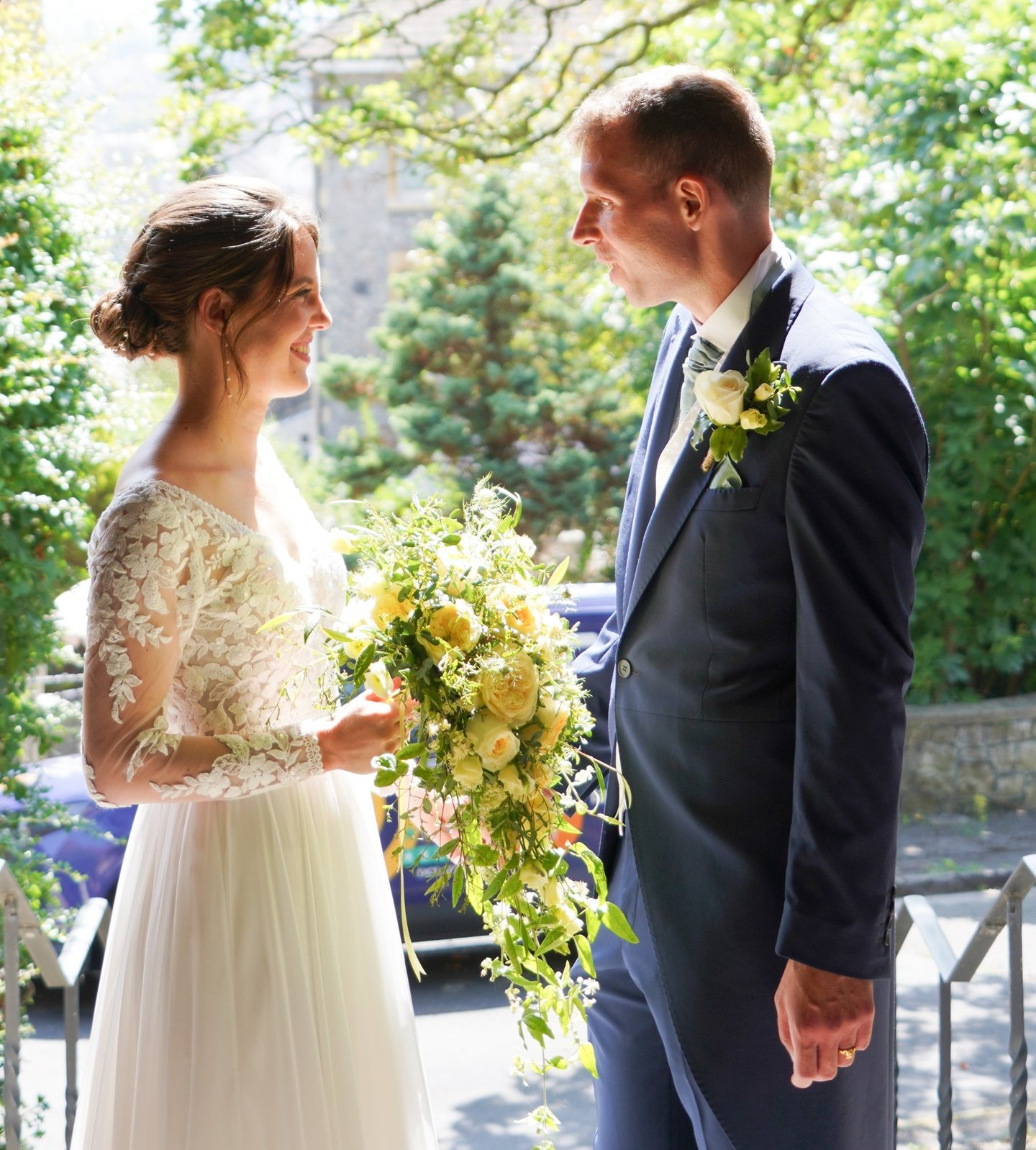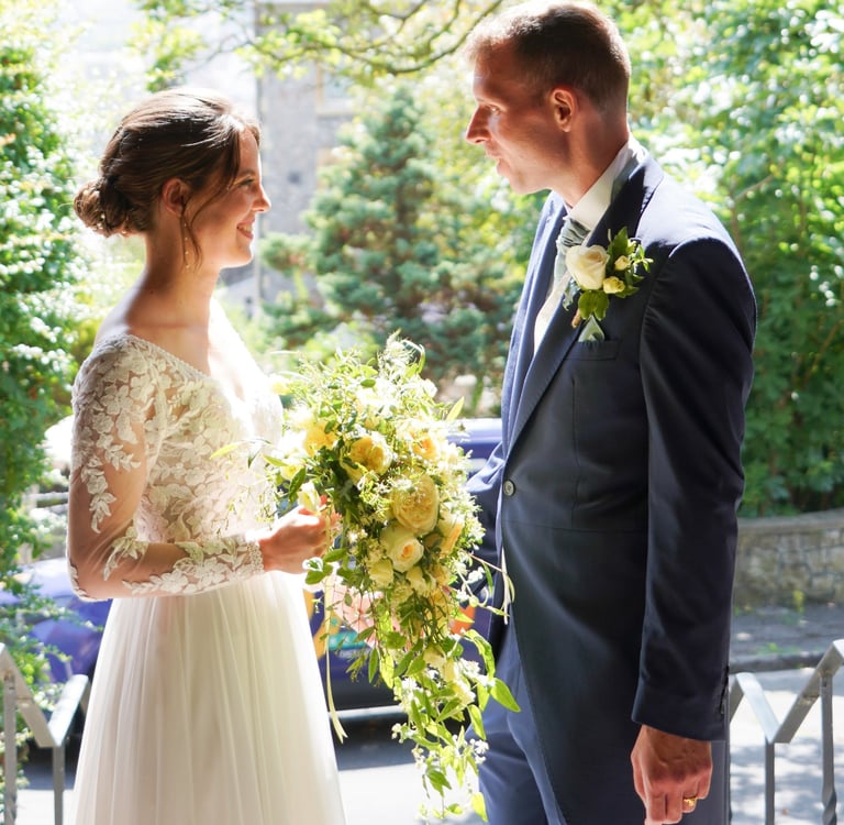 The bride had a very clear concept for her flowers - yellows and creams and lots of glorious greenery, which was very much my thing. I had great fun foraging for the bryony and other foliage. Have a look at the bridal bouquet, bridesmaids' hand-tied arrangements and basket arrangement for the flower girl.